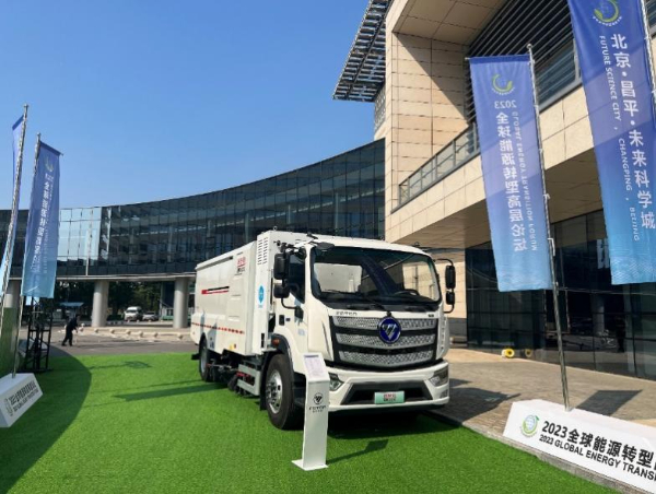 北汽集团旗下北汽福田携最新研发的氢燃料电池冷藏车、氢燃料电池环卫专用车产品亮相会场。