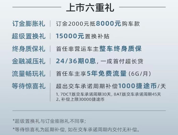 新车上市期间,捷途旅行者还为用户带来多重豪礼。即日起,订购捷途旅行者的用户,即可享受“订金膨胀礼”、“超级置换礼”、“终身质保礼”、“金融减压礼”、“流量畅玩礼”、“等待惊喜礼”六大权益。其中,“订金膨胀礼”为订金2000元抵8000元购车款;“超级置换礼”为15000元置换补贴(“超级置换礼”与“订金膨胀礼”不同享);“终身质保礼”为首任非运营车主整车终身质保;“金融减压礼”为24/36期0息,一成首付超长贷;“流量畅玩礼”为首任车主享5年免费流量(6G/月);“等待惊喜礼”为超出交车承诺周期补偿1000捷途币/天(7DCT版交车承诺周期30天,8AT版交车承诺周期45天,补偿上限30000捷途币,如在交车承诺周期内交付无补偿)。从订车到金融方案购车再到等车、用车,捷途旅行者都懂用户所想、满足用户所需,助力所有“旅行向往者”出发。