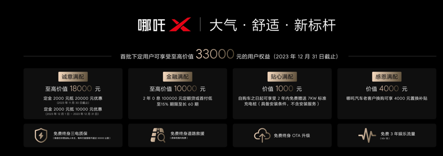 哪吒X为首批下定用户推出至高价值3.3万元的满配用户权益,11月底前下定,2000元定金最高可抵两万元,12月,定金两千元抵一万元优惠。此外,还有两年零息十万定额贷或首付低至15%的金融满配权益、购车之日起可享受两年内免费赠送7千瓦标准充电桩的贴心满配权益、老客户4000元购车置换补贴的感恩满配权益,以及诚意满满的服务承诺,包括免费终身三电质保、免费终身道路救援、免费终身OTA升级、免费3年每月5G的娱乐流量。