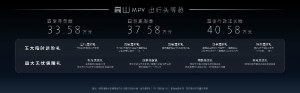 10月18日,魏牌MPV品类首款产品——魏牌高山MPV,推出3款车型,其中四驱尊贵版33.58万元、四驱旗舰版37.58万元、四驱行政加长版40.58万元,上市即交付。同时,发布会上魏牌还带来了五大限时进阶礼和四大无忧保障礼。