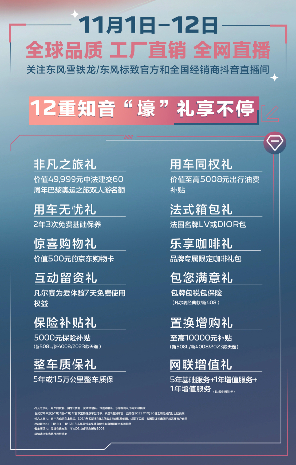 “享”万元补贴,“抽”巴黎游、大牌包,“看”网络大咖直播,“探”宝藏生活…神龙汽车“工厂直销会 嗨购双十一”豪礼霸气放送,让客户“双十一”嗨购到底,奏响 “双十一”宠粉“最强音”!11月1日-12日,关注东风雪铁龙、东风标致官方和全国经销商抖音直播间,参与“工厂直销会 嗨购双十一”,等你一起福利拿到手软,全球品质轻松购,即刻开启个性、时尚、优雅品味生活。