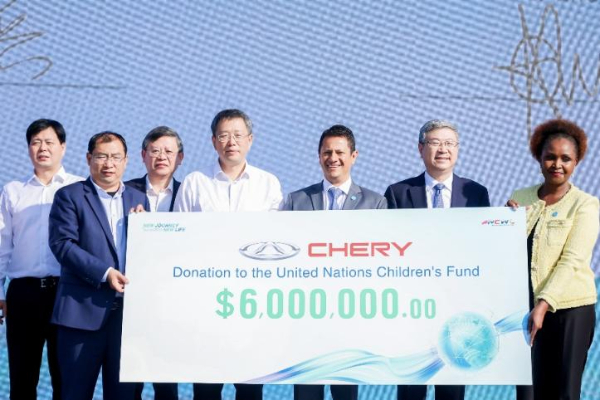 图为奇瑞汽车向联合国儿童基金会捐赠600万美元