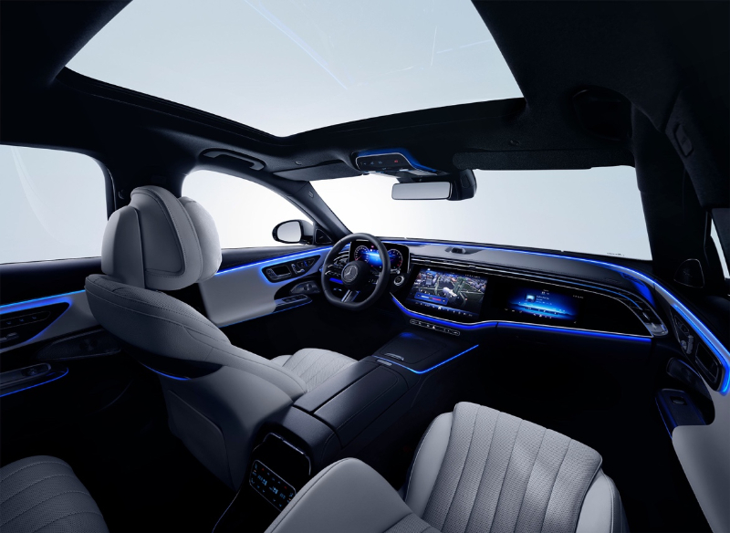 于内,360度环绕式环境氛围灯从仪表台经车门向后延伸,目光所及之处,流光溢彩,搭配全新“随音悦动”功能,氛围灯的美学设计通过数字科技灵动展现,赋予音乐除听觉以外的全新感受形式,打通感官的沉浸式愉悦体验。横贯仪表台的空调出风口与MBUX超级屏浑然一体,配合数字化风向调节功能,在呈现简洁动感的设计美感同时,更以智能化的风向调节方式,带来以人为本的舒适体感。全新长轴距E级车配备全新星河熠熠背光木饰板,精湛工艺凸显璀璨星辉。落座后排,可放倒36度的后排电动可调节座椅、后排座椅加长座垫、电动可调后排座椅腿托以及天鹅绒般的豪华型后排头枕带颈部加热功能,打造出媲美头等舱般的豪华舒适空间,更适宜长途乘坐。