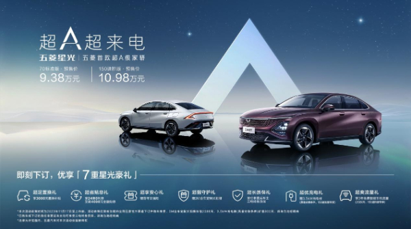2023年11月17日,五菱汽车在广州车展发布会上宣布旗下首款超A级家轿五菱星光正式开启预售。新车综合续航超1100km,提供70标准版和150进阶版两款配置版本,售价分别为 9.38万元及10.98万元。