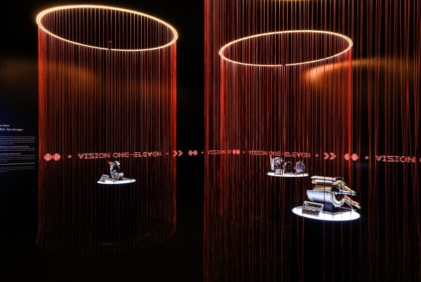 在一层的“正当时·时代风潮”展区,Vision One-Eleven概念车配合国际著名当代艺术家蔡国强的无人机焰火作品,在数字化、电动化、智能化的风潮之中,将美好的未来图景通过科技与艺术折射在当下,铺陈在观者眼前。