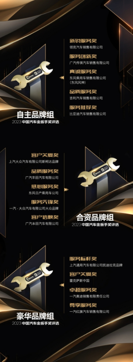 自2023年3月初启动,该评选历经候选品牌征集、网友及读者投票、发布入围品牌、媒体与行业专家评选及评委会最终审定等环节,共有14个国内优秀汽车企业及品牌荣获本年度金扳手奖,其中领克汽车、广汽传祺、东风风神、吉利汽车、比亚迪汽车获得自主品牌组分项奖,上汽大众斯柯达品牌、广汽丰田、东风日产、一汽-大众大众品牌、广汽本田获得合资品牌组分项奖,上汽通用凯迪拉克品牌、雷克萨斯中国、一汽奥迪、一汽红旗获得豪华品牌组分项奖。
