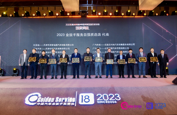 为了树立品牌服务标杆榜样,助力提升汽车服务质量,促进良好市场环境,主办方同期举办了2023金扳手服务百强质选店评选活动,该评选由中国汽车维修行业协会指导,依据金扳手GES-150服务评价标准和《放心汽修认证》团体标准,对候选经销商进行专业评审,最终共有12个品牌的全国100家优秀经销商获得“2023金扳手服务百强质选店”荣誉称号。