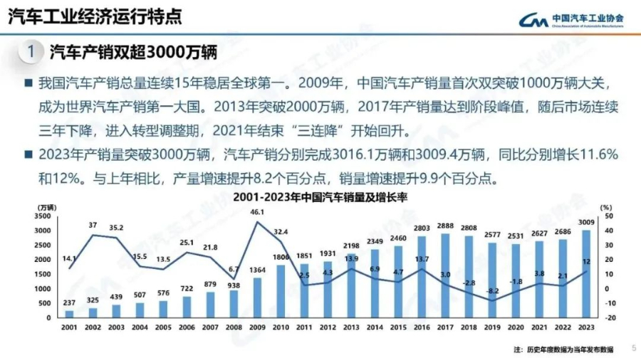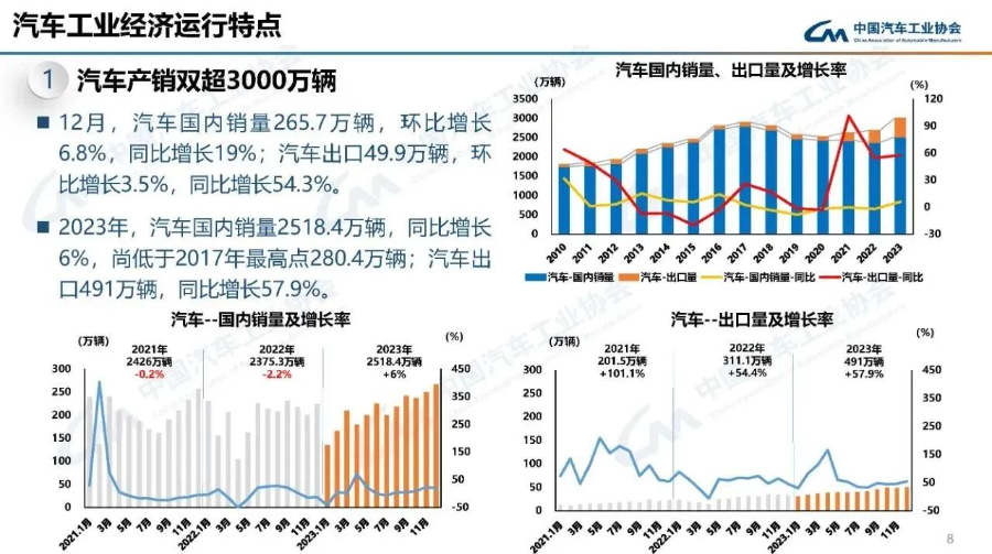 1月11日,中国汽车工业协会发布的统计分析数据显示,2023年,我国汽车产销累计分别完成3016.1万辆和3009.4万辆,同比分别增长11.6%和12%,产销量创历史新高,实现两位数较高增长。