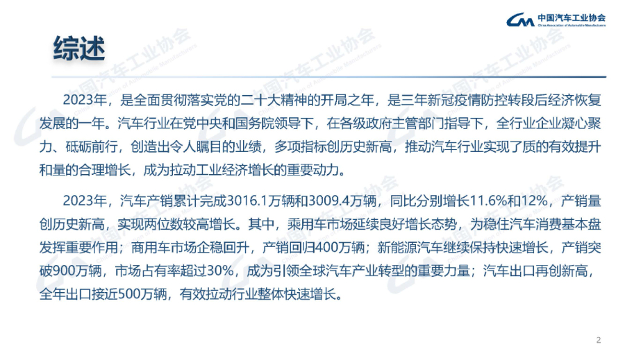 其中,乘用车市场延续良好增长态势,为稳住汽车消费基本盘发挥重要作用;商用车市场企稳回升,产销回归400万辆;新能源汽车继续保持快速增长,产销突破900万辆,市场占有率超过30%,成为引领全球汽车产业转型的重要力量;汽车出口再创新高,全年出口接近500万辆,有效拉动行业整体快速增长。