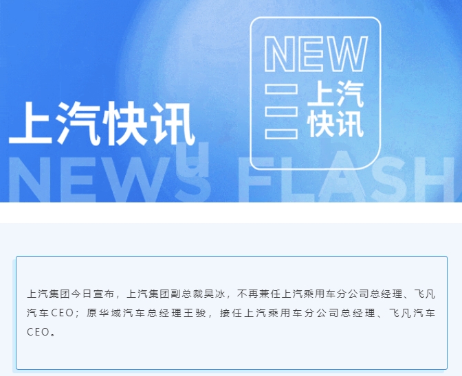 据上汽集团微信公号发布,上汽集团11日宣布,上汽集团副总裁吴冰,不再兼任上汽乘用车分公司总经理、飞凡汽车CEO;原华域汽车总经理王骏,接任上汽乘用车分公司总经理、飞凡汽车CEO。