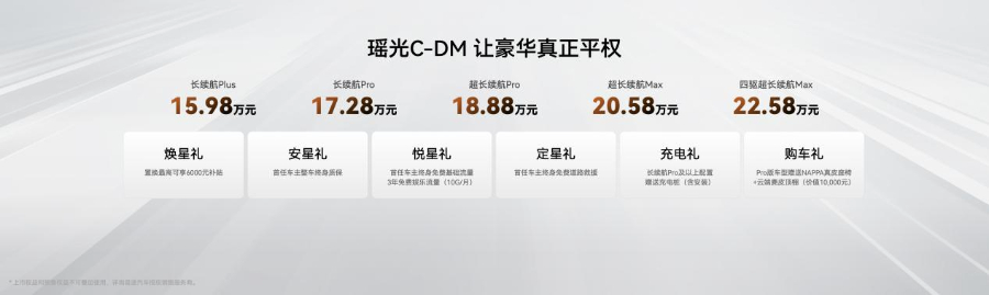 3月11日,备受期待的“40万级超舒适电混旗舰”星途瑶光C-DM全球高光上市。此次新车共推出5款版型,官方指导价分别为:长续航Plus 15.98万元、长续航Pro 17.28万元、超长续航Pro 18.88万元、超长续航Max 20.58万元、四驱超长续航Max 22.58万元,真正做到了“油电同价”,让用户看到了极大的新车诚意。立足于全球市场,瑶光C-DM以豪华平权为理念打造,基于行业领先的M3X超混|原生混动平台(以下简称:M3X超混平台)全新“第四代全域专混”技术,超100项旗舰级配置,全维度媲美C级车的越级享受,致力于成为中国家庭高品质混动SUV的首选车型之一。