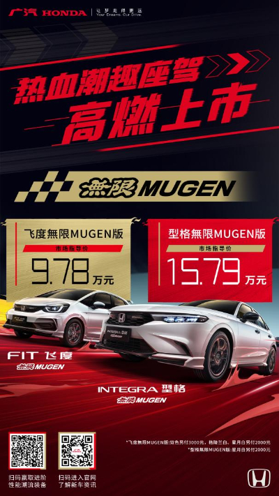 3月7日,广汽本田“無限MUGEN”热血双核(型格/飞度無限MUGEN版)在2024深圳国际定制改装汽车展览会上市。作为传承Honda热血基因的车型,型格和飞度在Honda改装品牌“無限MUGEN”的加持下,不仅让“無限MUGEN”变得触手可及,更将突破极限、追求极致的玩车基因注入双车。型格“無限MUGEN”版售价15.79万元起,飞度“無限MUGEN”版售价9.78万元起。