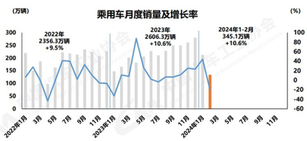 1-2月,乘用车产销分别完成336万辆和345.1万辆,同比分别增长7.9%和10.6%。“乘用车市场2月受春节影响较大,同环比均出现大幅下降,综合前两个月的数据更具参考性。”陈士华说。