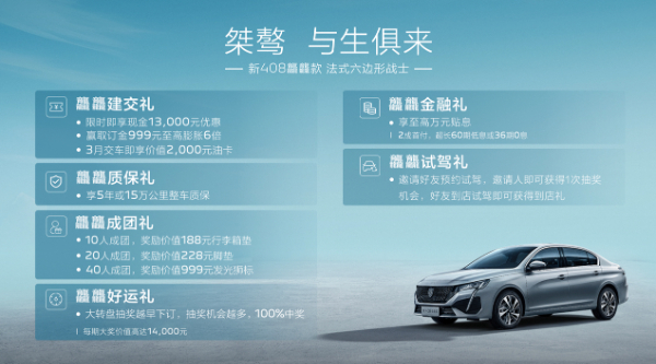 新408龘龘款上市共为客户提供龘龘建交礼、龘龘金融礼、龘龘质保礼、龘龘试驾礼、龘龘成团礼、龘龘好运礼六大豪华礼遇。