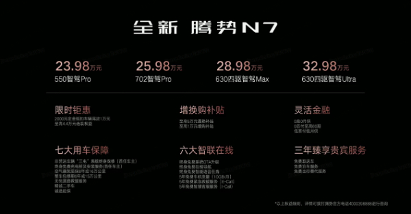 作为一款智电融合的豪华性能电动SUV,全新腾势N7以核心产品力和诚意满满的价格,打造极具质价比的30万级豪华车,为用户带来高品质出行选择。