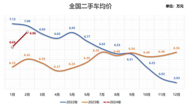 从车价来看,二手车交易均价持续回升。数据显示,2月二手车均价较1月增长0.31万元,较去年同期增长0.55万元。