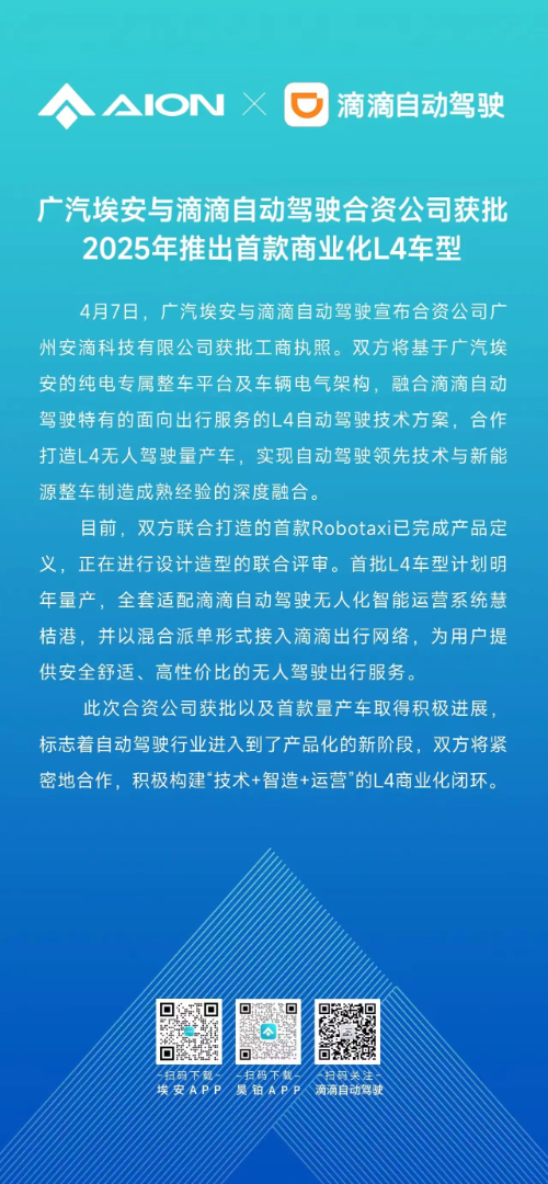 4月7日,广汽埃安与滴滴自动驾驶宣布合资公司——广州安滴科技有限公司获批工商执照。双方将基于广汽埃安的纯电专属整车平台及车辆电气架构,融合滴滴自动驾驶特有的面向出行服务的L4自动驾驶技术方案,合作打造L4无人驾驶量产车。