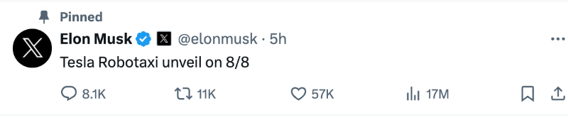 此外值得一提的是,马斯克还在X上丢出了一记重磅消息,他宣布特斯拉将在8月8日发布Robotaxi。