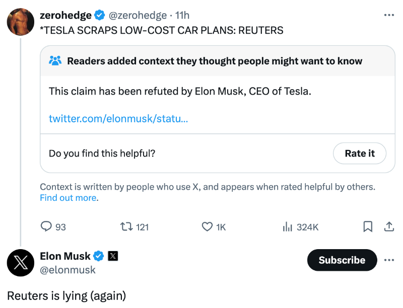 随后特斯拉CEO埃隆·马斯克在旗下社交媒体平台X上发文否认了这一报道,称其“又在说谎”。