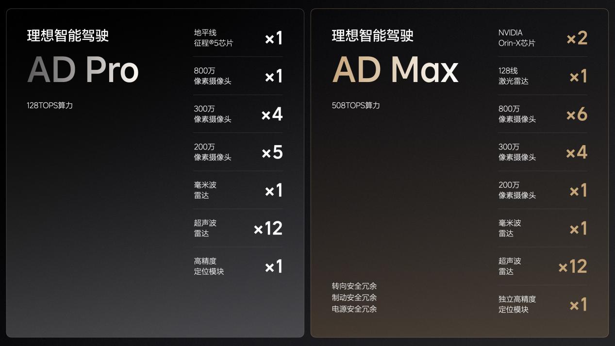 在智能驾驶硬件上,理想L6提供AD Pro和AD Max两种配置。理想L6 Pro标配AD Pro,配备地平线征程5智能驾驶芯片,128TOPS算力,10颗摄像头和1颗前向毫米波雷达。理想L6 Max标配理想AD Max ,配备2颗NVIDIA Orin-X智能驾驶芯片,508TOPS算力,1颗128线高分辨率激光雷达和环绕车身的11颗摄像头,实现视觉和激光雷达双重冗余。