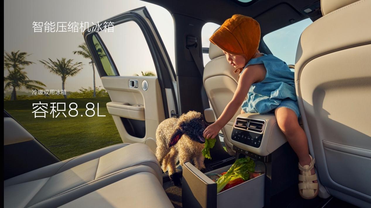 理想L6 Max标配带压缩机的智能冷暖双用冰箱。冰箱容积8.8升,可实现0-7°C制冷、35-50°C保温,制冷速度是半导体冰箱的6倍。在锁车后,冰箱支持远程控制、持续工作,运行一天电耗仅为0.5千瓦时,高效节能。