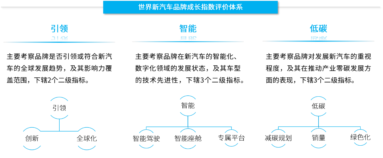 随后,王冀详细介绍了世界新汽车品牌成长指数评价体系。他表示,根据新汽车发展现状与趋势,新汽车研究所围绕着“引领”“智能”和“低碳”等3项原则构建了评价体系,体系有一级指标3个,二级指标8个。