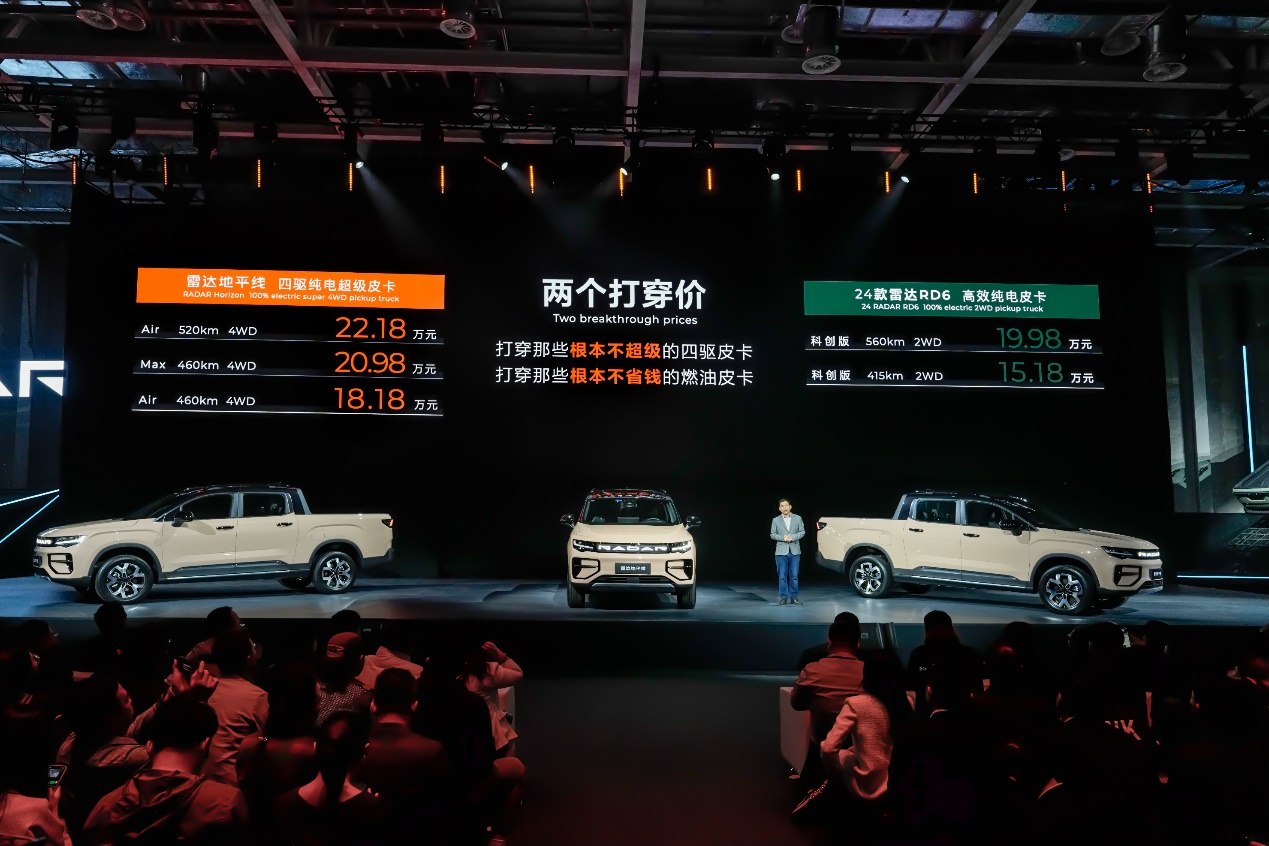 4月23日,以“超级皮卡 极限创无限”为主题的雷达地平线上市发布会在北京举办,新车定位四驱纯电超级皮卡,其中雷达地平线AIR 460km版售价18.18万元,MAX 460km版售价20.98万元,AIR 520km版售价22.18万元。雷达地平线的上市为户外趣玩潮客群体带来全面升级的“带电”新体验。同时,高效纯电皮卡雷达RD6发布2024款车型,其中科创版415km、560km版分别售价15.18万元与19.98万元。