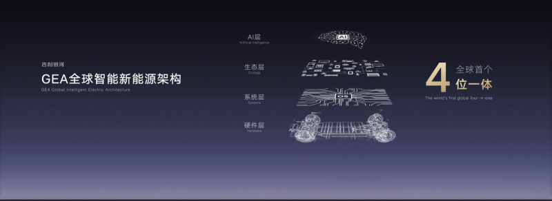 GEA全球智能新能源架构是 “硬件、系统、生态、AI”四位一体的AI智能架构,实现了空间设计、智能能源、全域安全、AI智能、驾控性能五大不设限。同时,作为全球新能源带宽超大的智能架构,它实现了全面电动化,支持纯电、混动、增程、绿色甲醇等全能源形式。此外,GEA3.0电子电气架构还能够让新能源汽车全面接入“AI智能生态域”,融合“多模态AIGC、AI数字底盘、AI智能驾驶”等高端技术,让造车进入“全面AI智能化”的新阶段。