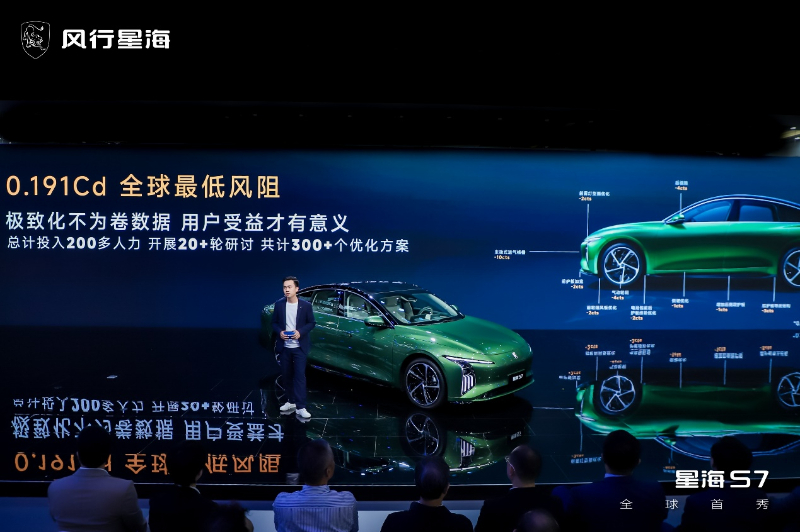 据介绍,风行星海投入200多人研发团队,共打磨了20余轮超300个优化方案,经过100多小时风洞试验测试与验证,最终在轮毂、3D阻风板、前格栅进气口等十三个部位分别降低0.001-0.016Cd风阻,最终达成了星海S7在开发验证过程做到的最低风阻0.191Cd。