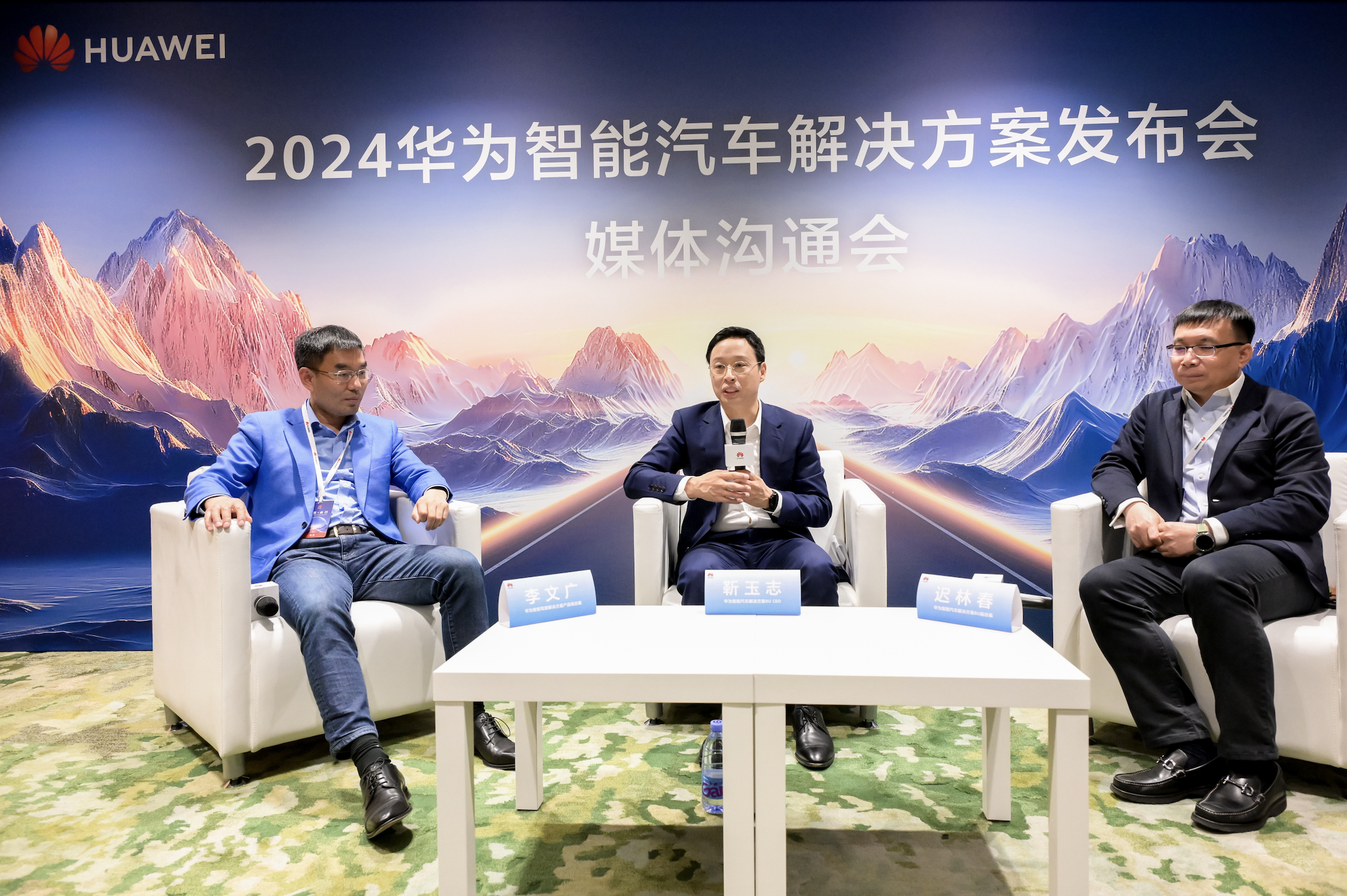 靳玉志、华为智能汽车解决方案BU副总裁迟林春、华为智能驾驶解决方案产品线总裁李文广参与了发布会后的访谈环节,并就行业定位、未来期许以及战略目标等问题进行了深入沟通。