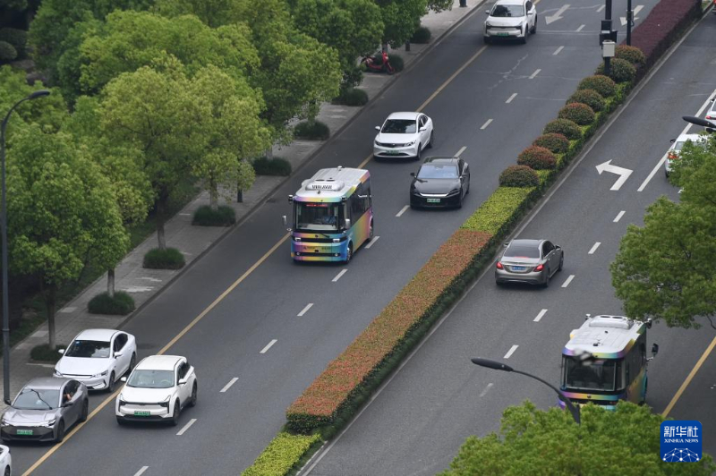5月22日,自动驾驶接驳示范线巴士行驶在杭州余杭未来科技城的道路上。