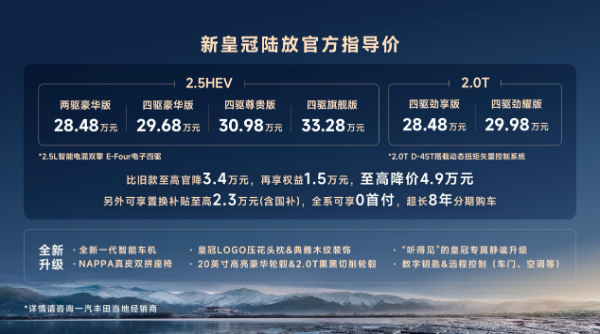 5月30日,一汽丰田新款皇冠陆放上市,比旧款至高降价4.9万元,其中,官方最高降幅3.4万元,售价区间为28.48万-33.28万元,另外可再享权益1.5万元。同时,可享含国补至高2.3万元置换补贴及0首付至高8年分期购车等多重政策。
