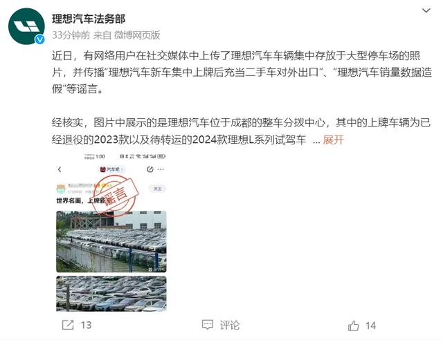 6月4日,理想汽车法务部在微博发文称,近日,有网络用户在社交媒体中上传了理想汽车车辆集中存放于大型停车场的照片,并传播“理想汽车新车集中上牌后充当二手车对外出口”“理想汽车销量数据造假”等谣言。
