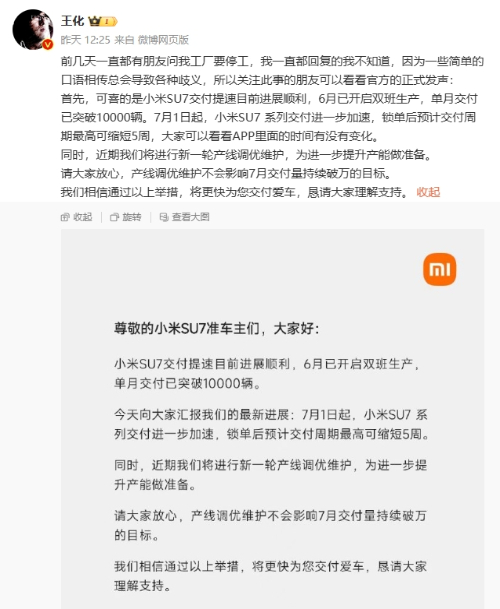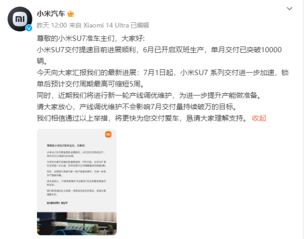 此外,小米汽车方面表示:“近期我们将进行新一轮产线调优维护,为进一步提升产能做准备。请大家放心,产线调优维护不会影响7月交付量持续破万的目标。”