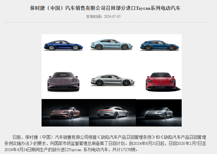 据国家市场监督管理总局缺陷产品召回技术中心消息,日前,保时捷(中国)汽车销售有限公司根据《缺陷汽车产品召回管理条例》和《缺陷汽车产品召回管理条例实施办法》的要求,向国家市场监督管理总局备案了召回计划。自2024年8月31日起,召回2020年1月7日至2024年4月24日期间生产的部分进口Taycan 系列电动汽车,共计17278辆。