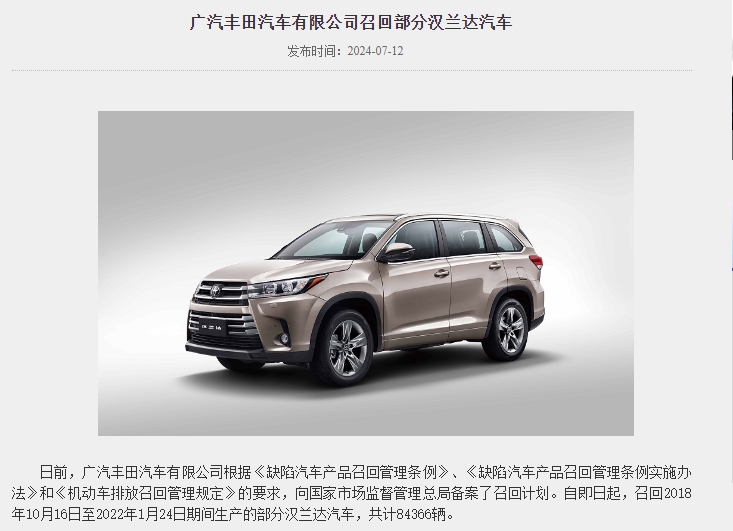 据国家市场监督管理总局缺陷产品召回技术中心消息,日前,广汽丰田汽车有限公司根据《缺陷汽车产品召回管理条例》、《缺陷汽车产品召回管理条例实施办法》和《机动车排放召回管理规定》的要求,向国家市场监督管理总局备案了召回计划。自即日起,召回2018年10月16日至2022年1月24日期间生产的部分汉兰达汽车,共计84366辆。