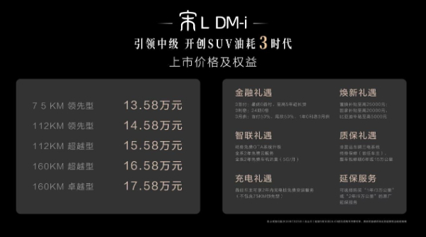 宋L DM-i此次推出纯电续航里程75KM、112KM和160KM三个版本,共5款车型,售价13.58万-17.58万元。
