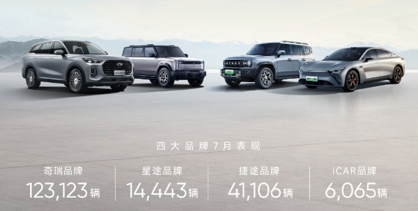 四大主力乘用车品牌中:奇瑞品牌7月销量123,123辆,同比增长20.4%;1-7月销量829,890辆,同比增长38.3%;星途品牌7月销量14,443辆,同比增长26%;1-7月销量68,890辆,同比增长28.3%;捷途品牌7月销量41,106辆,同比增长91.1%;1-7月销量264,661辆,同比增长97.7%;iCAR品牌首款产品上市5个月,7月份销量6,065辆;今年以来累计销量31,651辆。