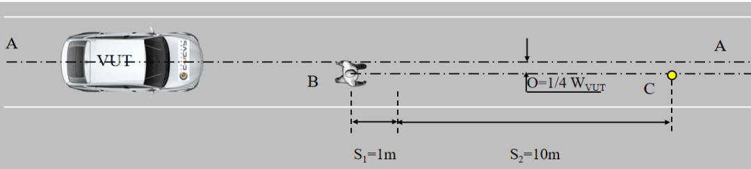 3、车辆直行与前方纵向行驶的电动自行车测试场景(CBLA)