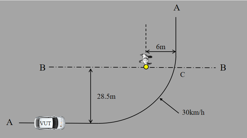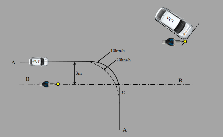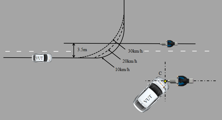 CSTA-RN场景下踏板摩托车以20km/h的速度以与车辆行驶方向相同的方向移动。VUT分别以10km/h、20km/h的速度测试。碰撞位置在车辆右前处。该场景主要考察车辆系统在右转弯过程中,对相邻车道同向驶来的踏板摩托车的识别及响应能力。