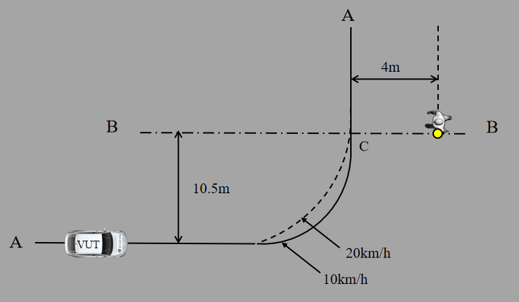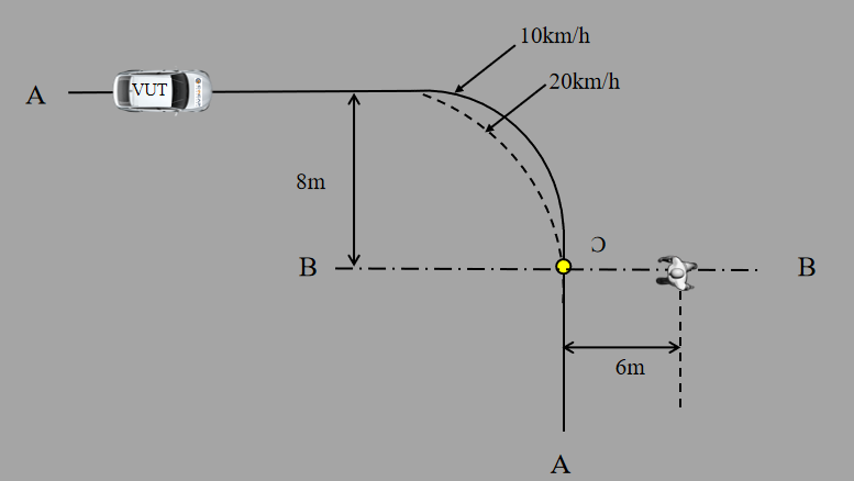CPTA-RF场景下,行人以6.5km/h的速度自相对车辆行驶方向的左侧向右侧移动。VUT分别以10km/h、20km/h的速度测试。碰撞位置在50%处。