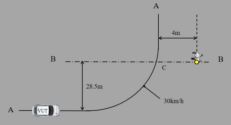 CPTA-LN场景下,行人以5km/h的速度自相对车辆行驶方向的右侧向左侧移动。VUT分别以10km/h、20km/h、30km/h的速度左转测试。碰撞位置在50%处。