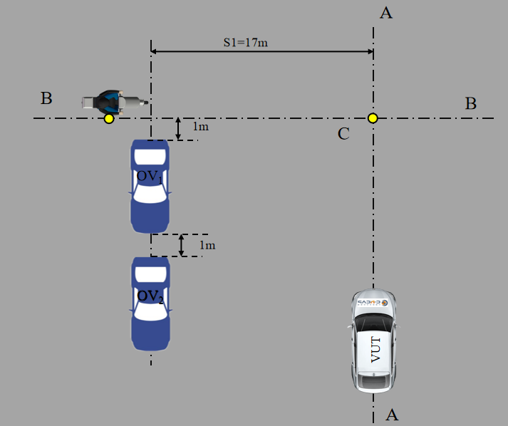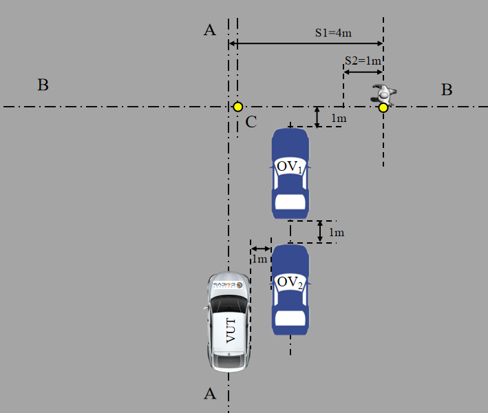 该场景为新增场景,难度较高,主要考察车辆系统对于近端横穿儿童目标物的识别和目标物运动轨迹的判断能力,由于障碍车的存在,导致目标物在到碰撞点前,会消失在试验车的“视野”内一段时间,再加上儿童目标物尺寸本身较小且从近端出现,对车辆的感知和响应能力要求更高。特别对于高速测试点,留给车辆系统的反应时间很少,难度较大。