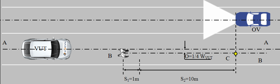 CPLA测试场景分别进行白天和夜晚测试,在夜晚测试时,无路灯辅助照明,VUT开启近光灯。且新版夜间场景,要求在对向车道中间距离碰撞点0m处,停放障碍车,并开启近光灯。