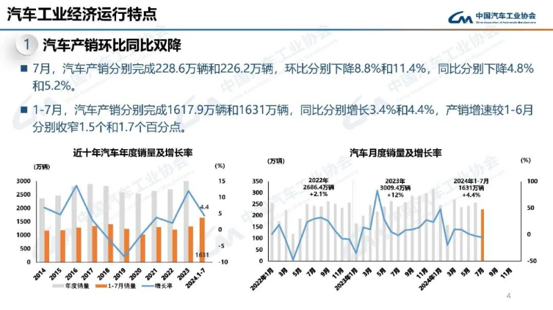 同时,中汽协发布今年以来的汽车产销情况显示,1-7月,汽车产销分别完成1617.9万辆和1631万辆,同比分别增长3.4%和4.4%。