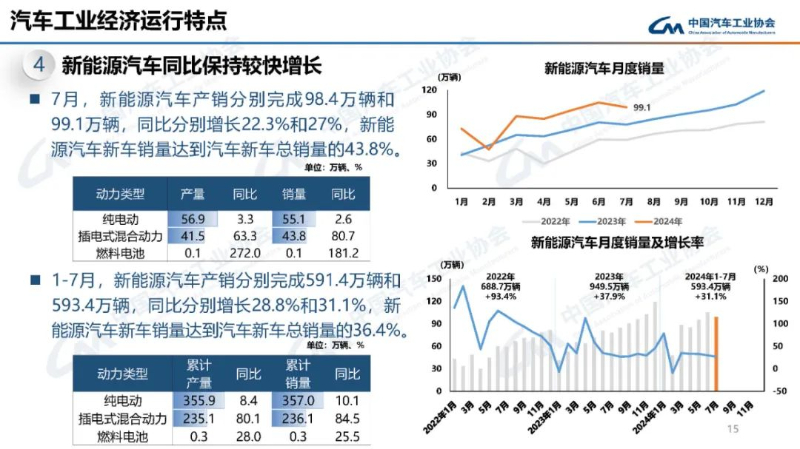 在新能源汽车方面,1-7月,新能源汽车产销分别完成591.4万辆和593.4万辆,同比分别增长28.8%和31.1%,新能源汽车新车销量达到汽车新车总销量的36.4%。7月,新能源汽车产销分别完成98.4万辆和99.1万辆,同比分别增长22.3%和27%,新能源汽车新车销量达到汽车新车总销量的43.8%。