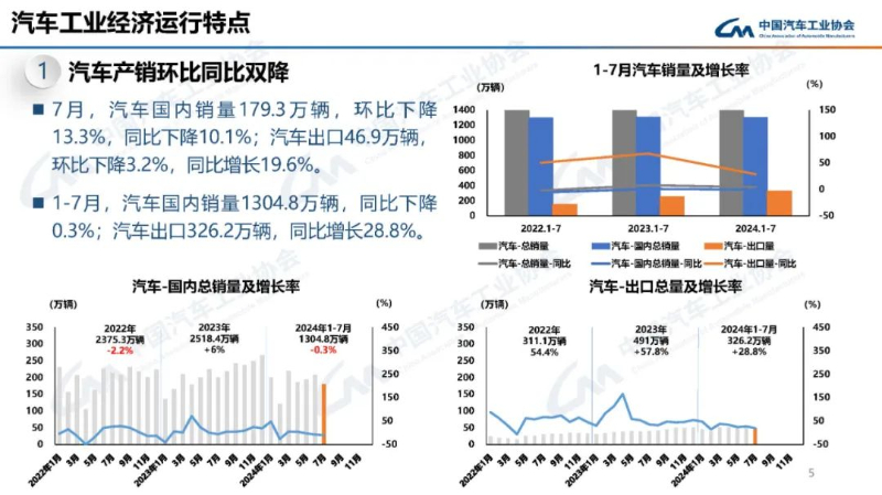 8月9日,中国汽车工业协会发布2024年7月汽车工业产销情况。数据显示,7月,汽车产销分别完成228.6万辆和226.2万辆,环比分别下降8.8%和11.4%,同比分别下降4.8%和5.2%。据中国汽车工业协会分析,7月,车市进入传统淡季,部分厂家迎来高温休假,产销节奏有所放缓,整体市场表现相对平淡,环比同比均呈现下降。其中,乘用车和商用车产销环比同比双降,新能源汽车和汽车出口同比继续保持较快增长。