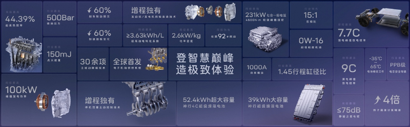 不仅在静谧性方面表现出色,昆仑增程HE 1.5T 超增压专用发动机的热效率与油电转化率同样达到了行业领先水准。由于超增压专用发动机无需直接驱动车辆,和相同排量的传统发动机相比,其气缸口径更小,加之更高的喷油压力与火花塞能量,将热效率提升至44.39%,燃烧一升油可发电3.63度,大幅降低油耗。