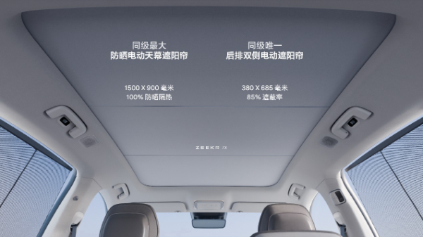 面对用户对防晒、隐私等方面的真实需求,极氪7X也进行了精细化考量。全系标配尺寸领先同级的超大全景天幕和同级最大的防晒电动遮阳帘,全系标配后排双侧电动遮阳帘,不仅让座舱更加凉爽,更能让后排乘员得到旗舰MPV级别的隐私保护。