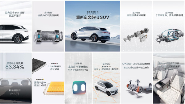 全系标配全栈800伏的高压系统;全系标配高性能碳化硅电驱;全系标配前双叉臂、后五连杆独立悬架,并可搭载同级领先的空气悬架+CCD;全系标配一体式压铸后端铝车身、全球首创的穹甲车身、远端安全气囊等顶级安全配置;全系标配21个高保真扬声器、AR- HUD、8295智能座舱芯片,双Orin-X智驾芯片,激光雷达、浩瀚智驾2.0等。极氪7X以极致产品力,从用户最本质的需求出发,重新定义纯电SUV新标准。